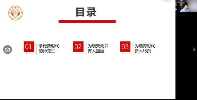 在第三部分为培育时代新人尽责中,薛教授提醒所有大一新生要做好一位老师,培育新一代首先要有理想信念,明确自己需要指导培育的是怎样的人。在讲座的最后,薛教授对新生明确的提出了树立师德,强化师能的要求,期待学生能成为有理想信念,有道德情操,有扎实学识,有仁爱之心的四有好教师。