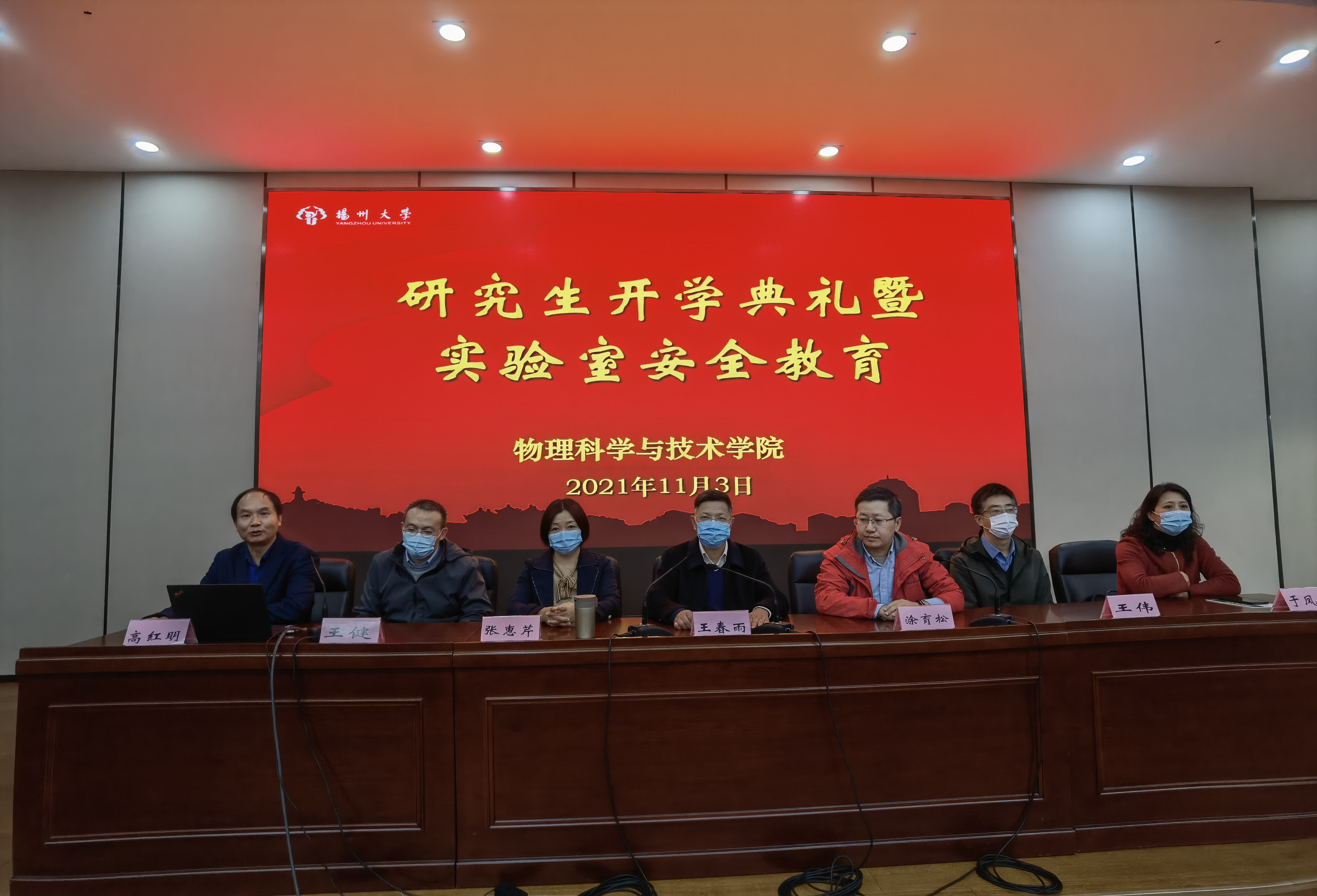 2021年11月3日下午,我院于瘦西湖校区新教学楼四楼报告厅召开研究生开学典礼。学院党委书记王春雨老师,院长涂育松老师,院党委副书记高红明老师,副院长王伟老师、王健老师、于凤云老师出席本次典礼,全体辅导员以及2021级全体研究生参加此次典礼。