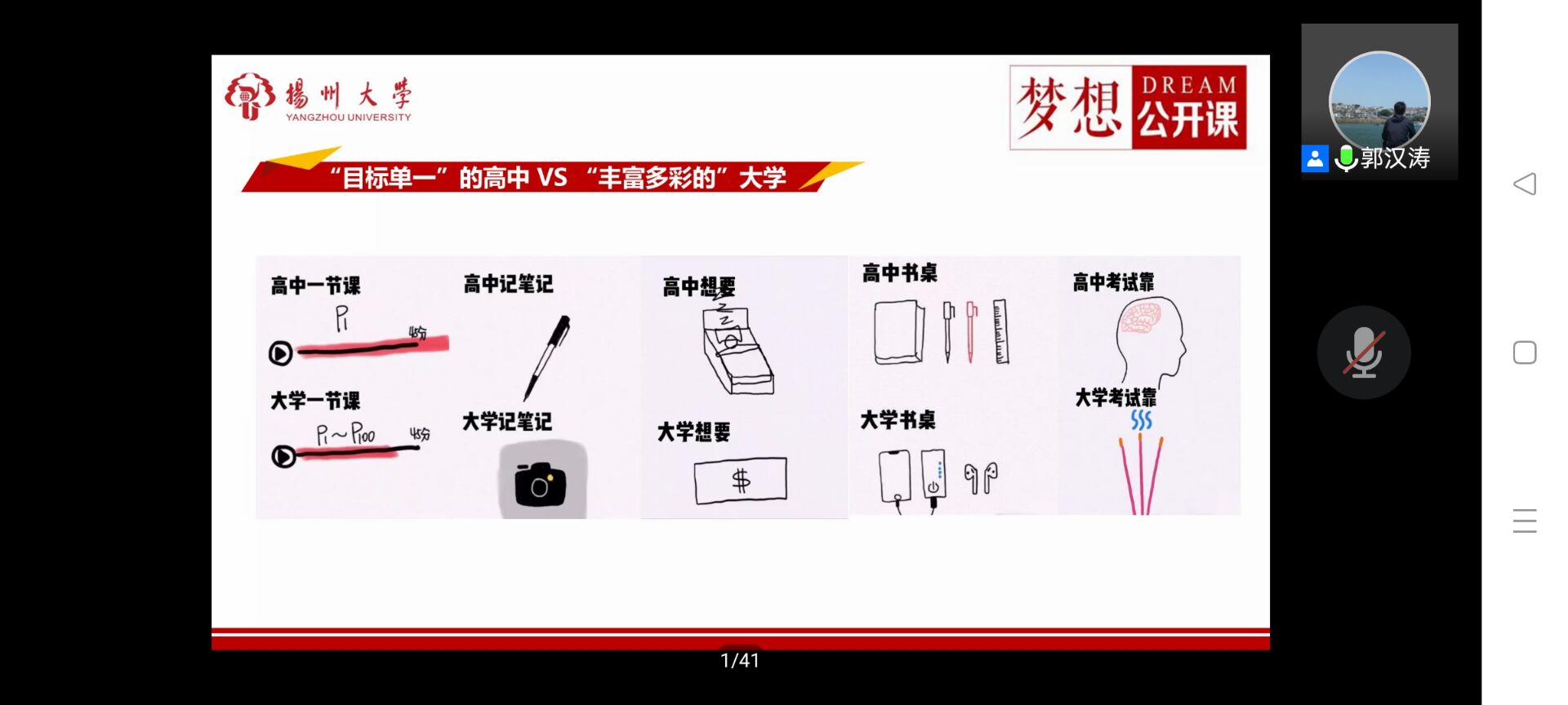 接下来,郭老师请所有同学思考:大学生活与高中生活有什么不同?是上课内容,记笔记的方式,亦或是对待考试的态度?周炜煜、谭盼盼、温晨鑫三位同学道出了自己眼中的大学生活,张雨濛、孔桢尧、田桉雨等学长学姐们也讲述了自己的大学生活及经验教训,在为大一新生展示多姿多彩的大学生活的同时,也强调有规划的大学生活才是圆满的,而没规划的大学生活则是浑浑噩噩。