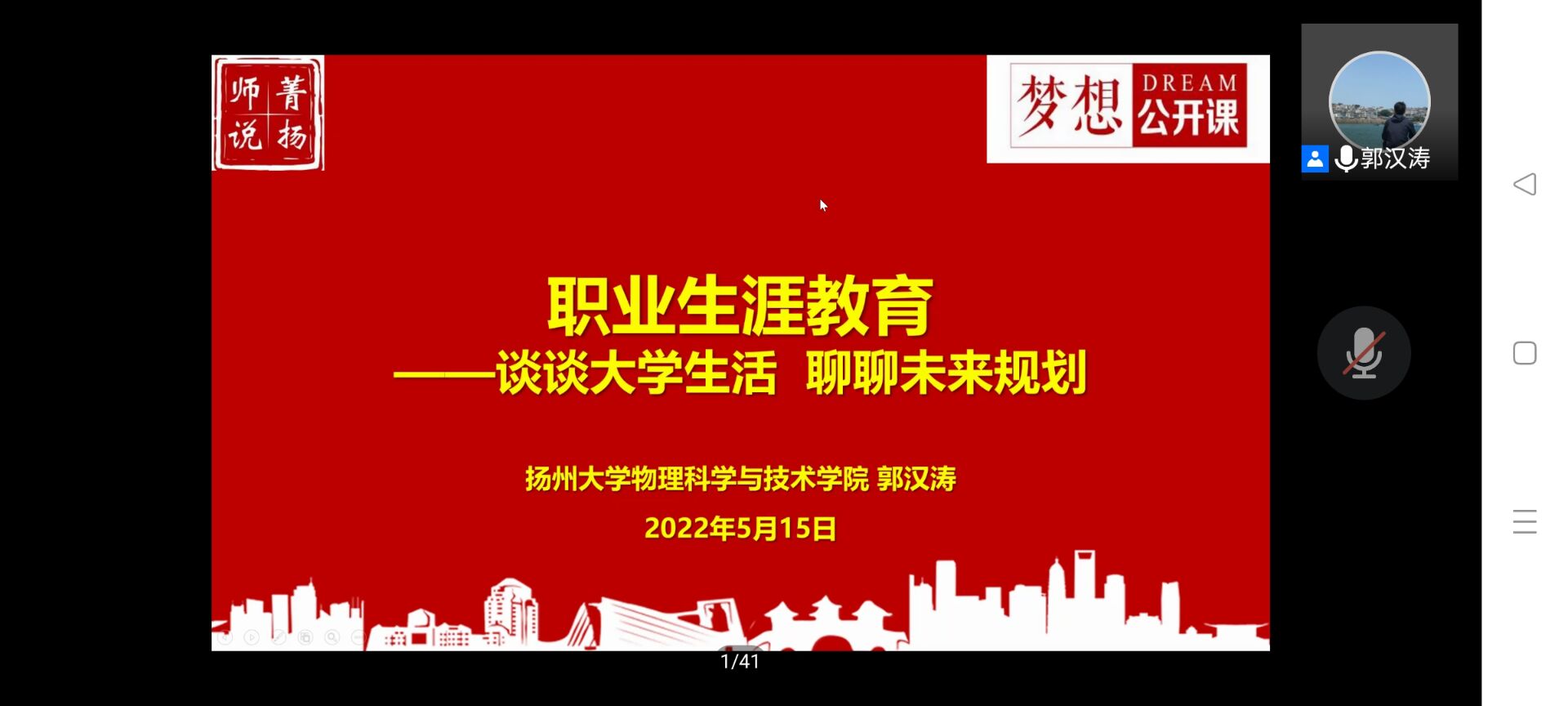 2022年5月15日下午3点,我院于线上举办团课第四讲,辅导员郭汉涛老师为全体学员带来职业生涯教育专题讲座——谈谈大学生活,聊聊未来规划。旨在帮助学生确定最佳的职业定位,并作出行之有效的安排,度过精彩的大学时光。