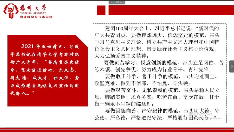 会议开始,张老师带领学员们对习近平总书记在庆祝中国共产主义青年团成立100周年大会上的讲话原文进行了学习,并以习近平总书记在2021年五四前夕在清华大学考察时的勉励之语为引,并再次以习近平总书记对共青团员提出的“五要做”来勉励学员们要做志存高远、好学进取、遵纪守法的团学骨干。