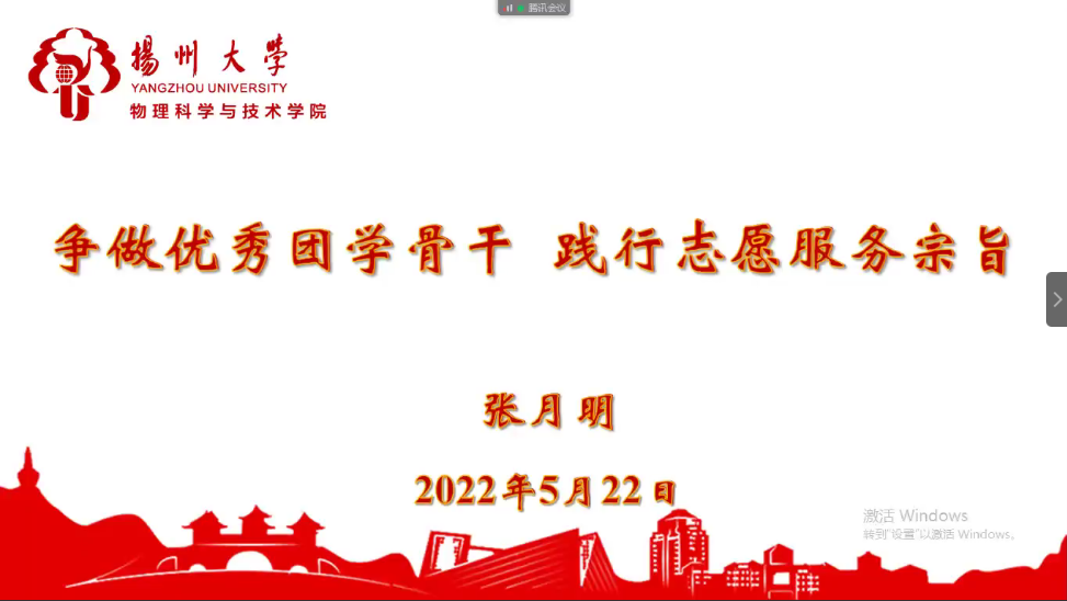 为了鼓励同学们在实现中国梦的历史接力赛上奋勇争光、积极践行习近平总书记在中国共产主义青年团成立100周年大会上的重要讲话精神,我院于5月22日下午在线上举办了团课第五讲,院团委副书记张月明老师为大家带来了《争做优秀团学骨干,践行志愿服务宗旨》的主题讲座。