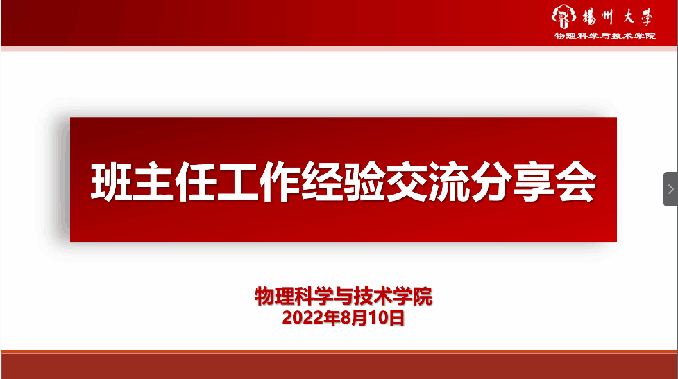 为更好的规划开展新生入学后班级管理等各项工作,8月10日下午3点,我院以线上线下相结合的形式召开2022年班主任工作经验分享交流会。院党委副书记高红明老师、院团委副书记张月明老师、物教2002班班主任潘丽华老师,辅导员荐小纯老师、郭汉涛老师,2022级全体新生班主任以及班主任助理参与此次会议,本次会议由辅导员华如楠老师主持。