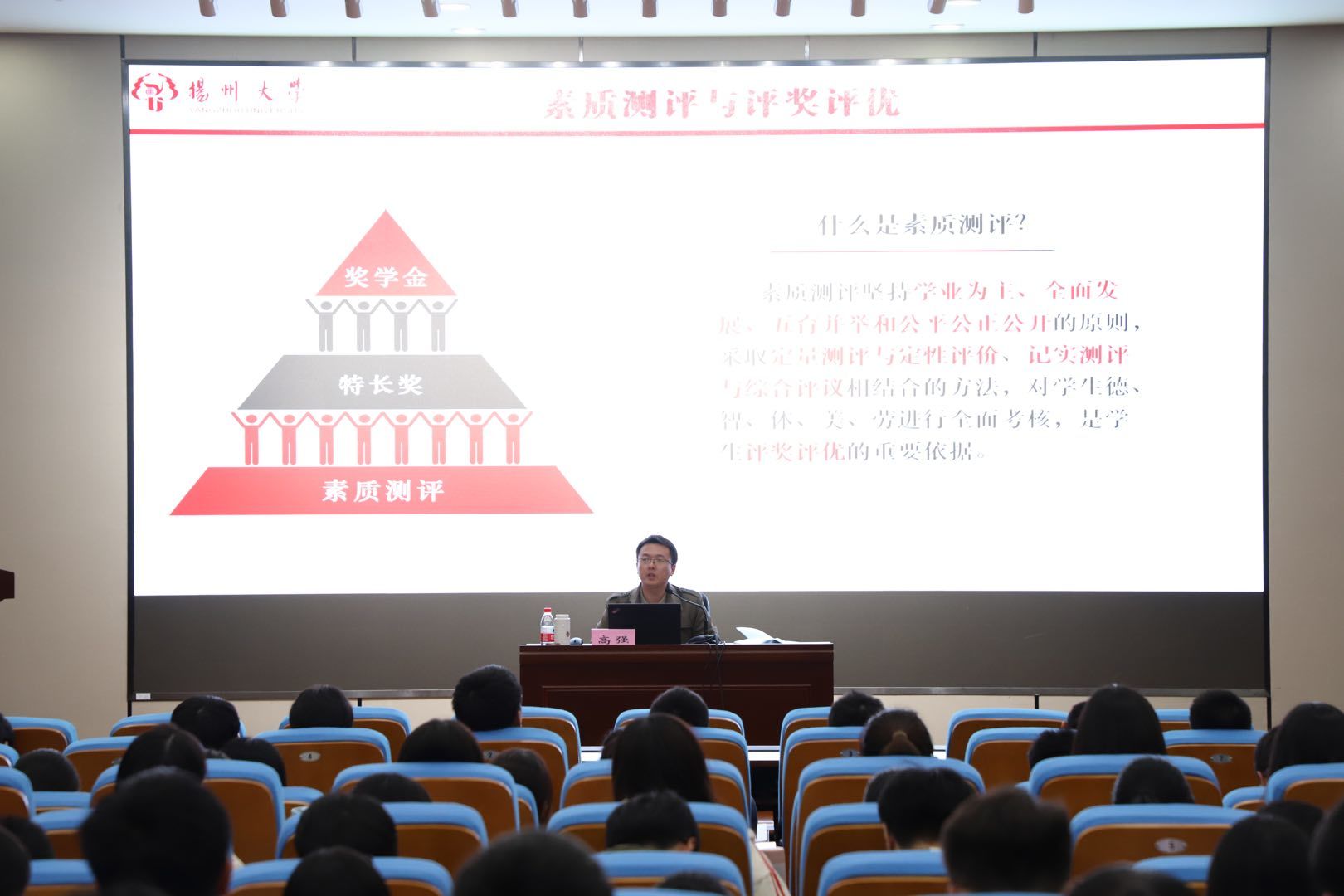 随后,高老师从历史发展沿革、发展成就等方面对学校进行了介绍,从历史中解读扬州大学的韵味,让同学们心中扬州大学的形象更加立体。考虑到新入学的同学们对大学生活还不适应,高老师结合自身多年学生工作的经历,向同学们提出了几点建议:务必认识到学习是大学的首要任务,寻找适合自身的学习方法,积极参与学习研讨,尽早确立属于自己的目标并制定计划,为着自己的目标而进发;同时希望各位同学挖掘自己身上的闪光点,发展自己的兴趣爱好,度过多彩的大学生活!