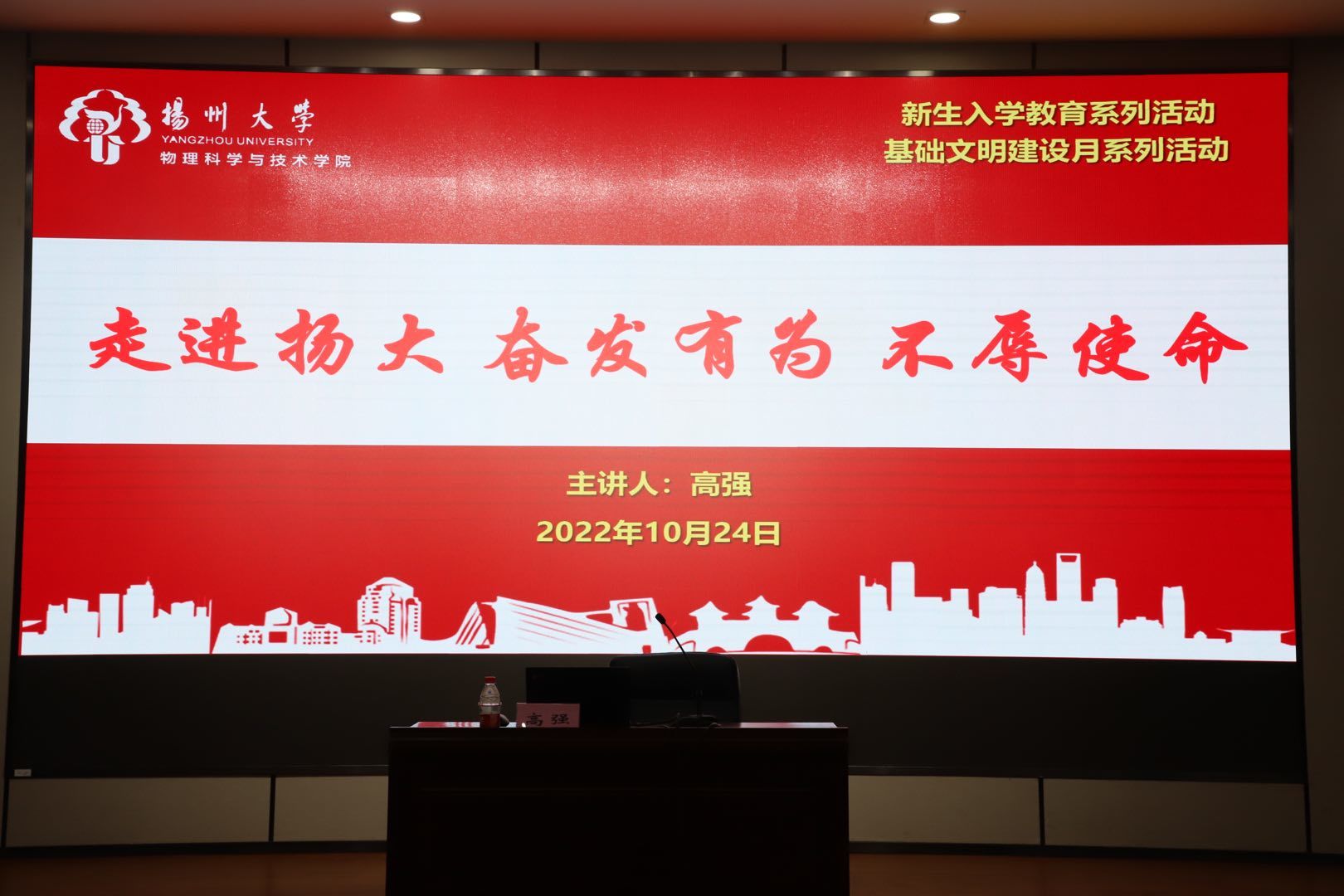 为让全体新生对校史校情、校纪校规、奖惩条例等有更加深刻的了解,10月24日晚,我院邀请到校学生党建指导中心主任高强老师,为新生开展“走进扬大 奋发有为 不辱使命”专题讲座。讲座由院团委副书记张月明老师主持,辅导员华如楠老师及我院全体2022级新生参与本次讲座。