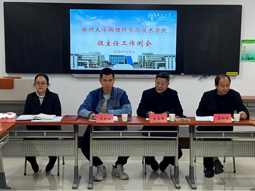 11月16日下午,物理科学与技术学院在瘦西湖校区8号楼S208召开11月班主任工作例会。院党委书记王春雨、动科学院党委副书记高红明、院党委副书记毕瑜林出席会议,物理学院本、研全体班主任和团委全体辅导员参加会议。会议由院团委副书记张月明主持。
