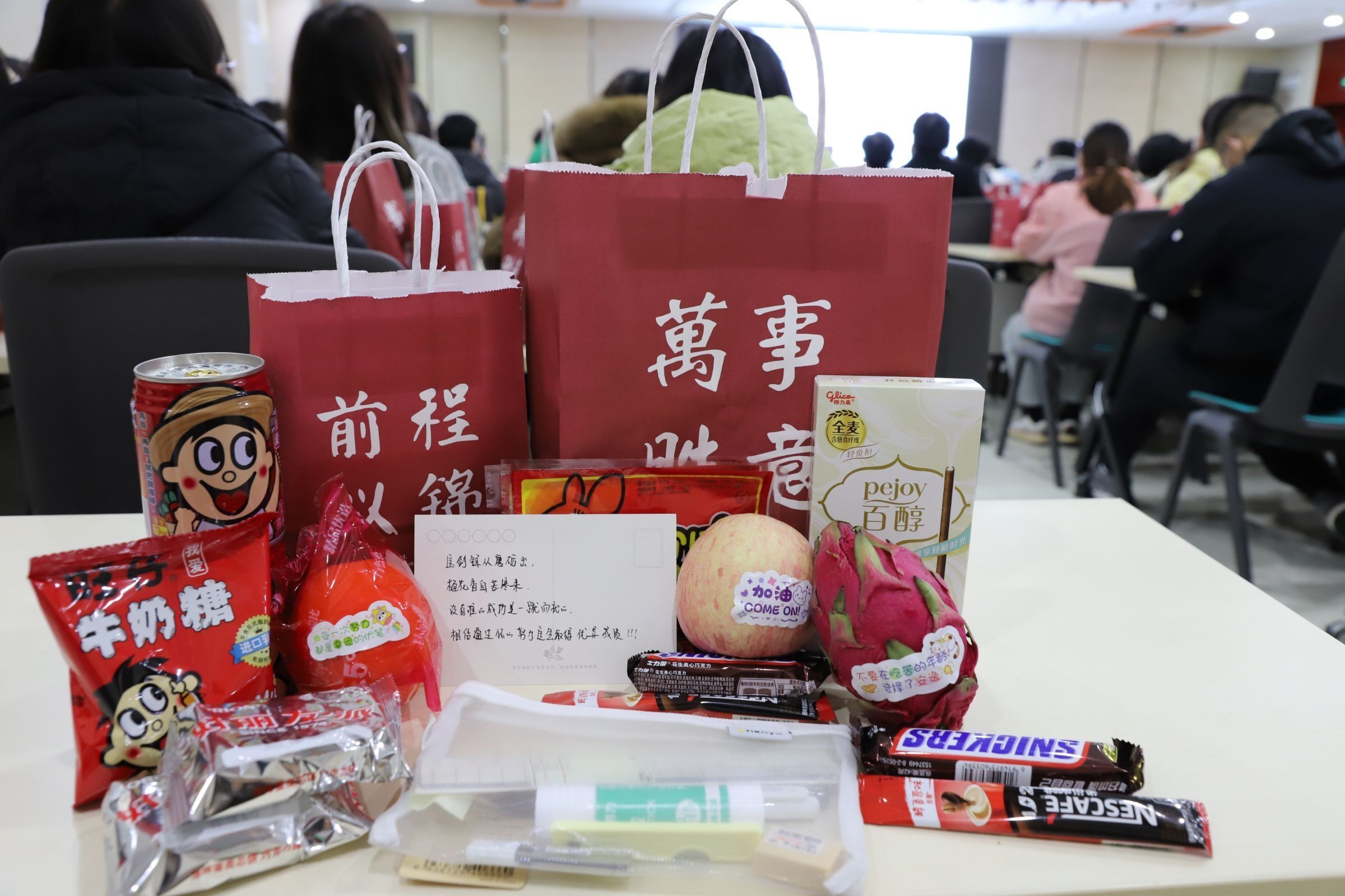 随后,毕瑜林书记和张月明老师向考研学子代表发放慰问品,包含“暖心”礼包、“助考”礼包双重惊喜,内容包含文具套装、旺仔牛奶、新鲜水果等,每个礼包还包含一份老师手写的加油卡片,多重礼物承载着满满的祝福。同学们纷纷表示感受到了学院的关怀与期望,会迎难而上,一鼓作气,争取获得理想成绩。