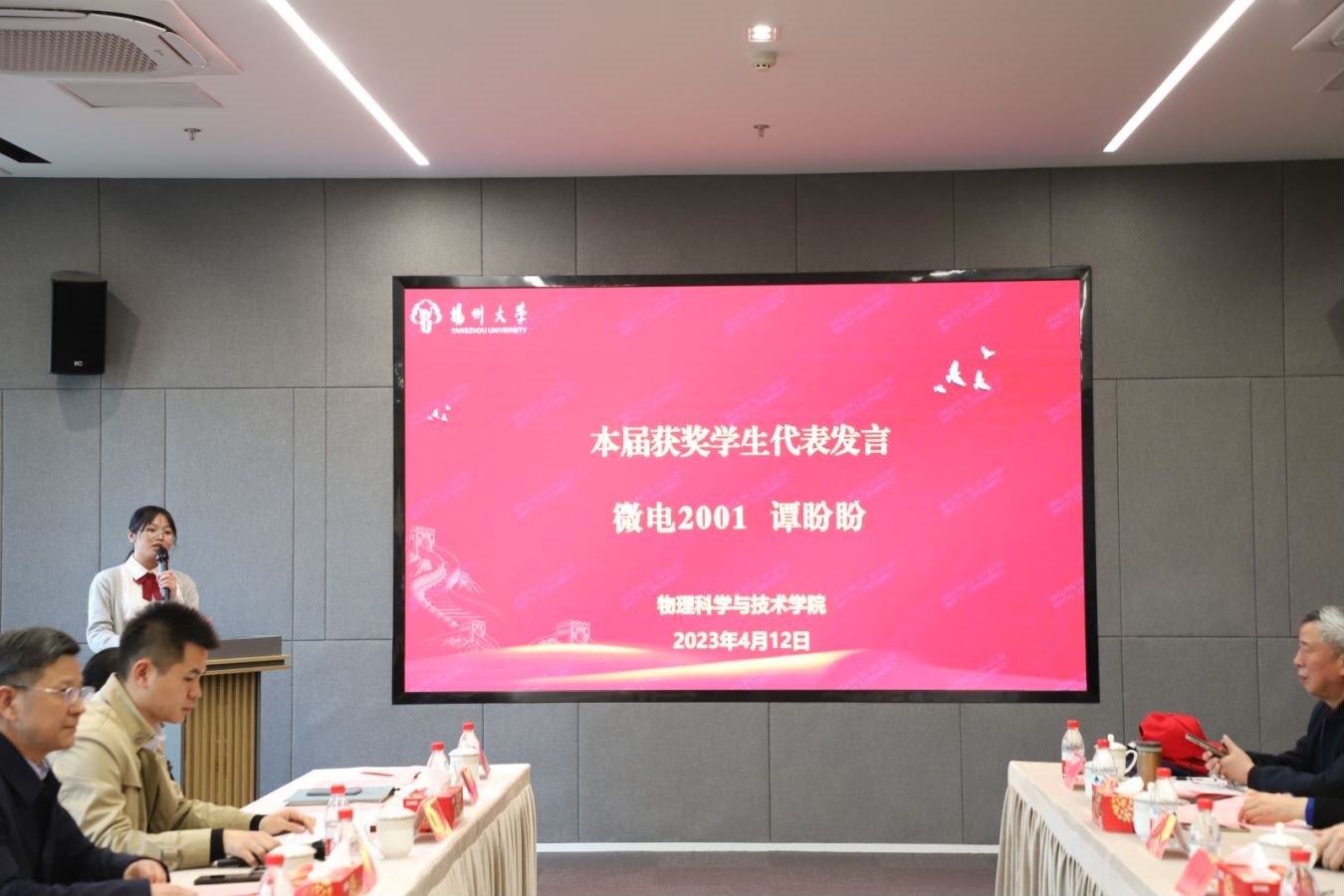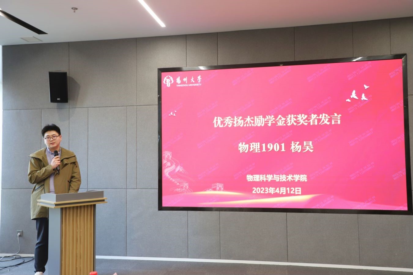 为选树典型,鼓励奋进,我院隆重举行扬杰励学金颁发仪式,以榜样的力量激励全体同学奋发向上,继续勇攀高峰。会议伊始,由王春雨书记宣读获得《关于表彰2022-2023学年扬杰励学金获得者的决定》,并勉励获得表彰的同学要自立自强,踔厉奋发,砥砺前行,同时也希望全院学生以他们为榜样,刻苦钻研,积极进取。梁隆圣书记、扬杰副总裁刘从宁、校对外联络办公室领导、校关工委领导分别为本届获得扬杰励学金的学生颁发证书。