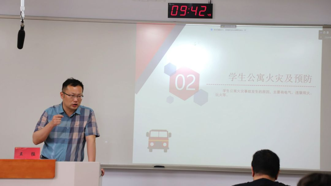 接着,王老师讲述了学生公寓火灾常见的类型和发生原因。他结合身边的真实案例警醒同学们注意用电安全,合理使用照明灯具,并重点分享了疏散逃生的自救要点。
