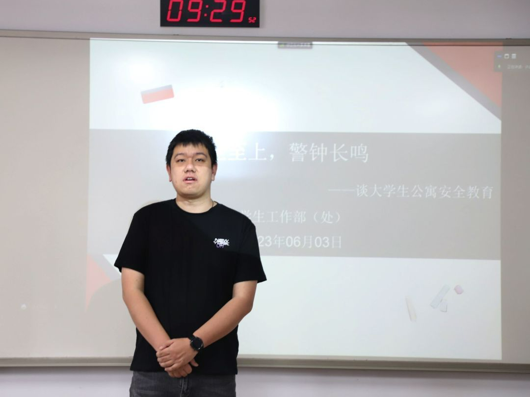为提高同学们的安全意识,营造良好公寓环境, 6月3日上午,我院于新教学楼S101举办了青年共产主义学校2023年春学期团课第三讲。校党委学生工作部(学生工作处)学生事务管理科科长王猛老师为全体学员带来《安全至上,警钟长鸣》主题团课,院宿舍管理辅导员许武韬主持此次团课。