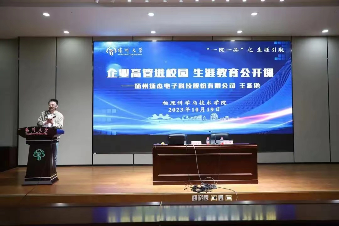 在10月19日下午16:30,我院邀请了扬州扬杰电子科技股份有限公司人力资源行政总监王冬艳于瘦西湖校区的S405开展了一场题为“企业高管进校园生涯教育公开课”的主题报告。院团委辅导员老师以及2023级全体学生参与了此次报告。本次报告由物理学院副院长王伟老师主持。