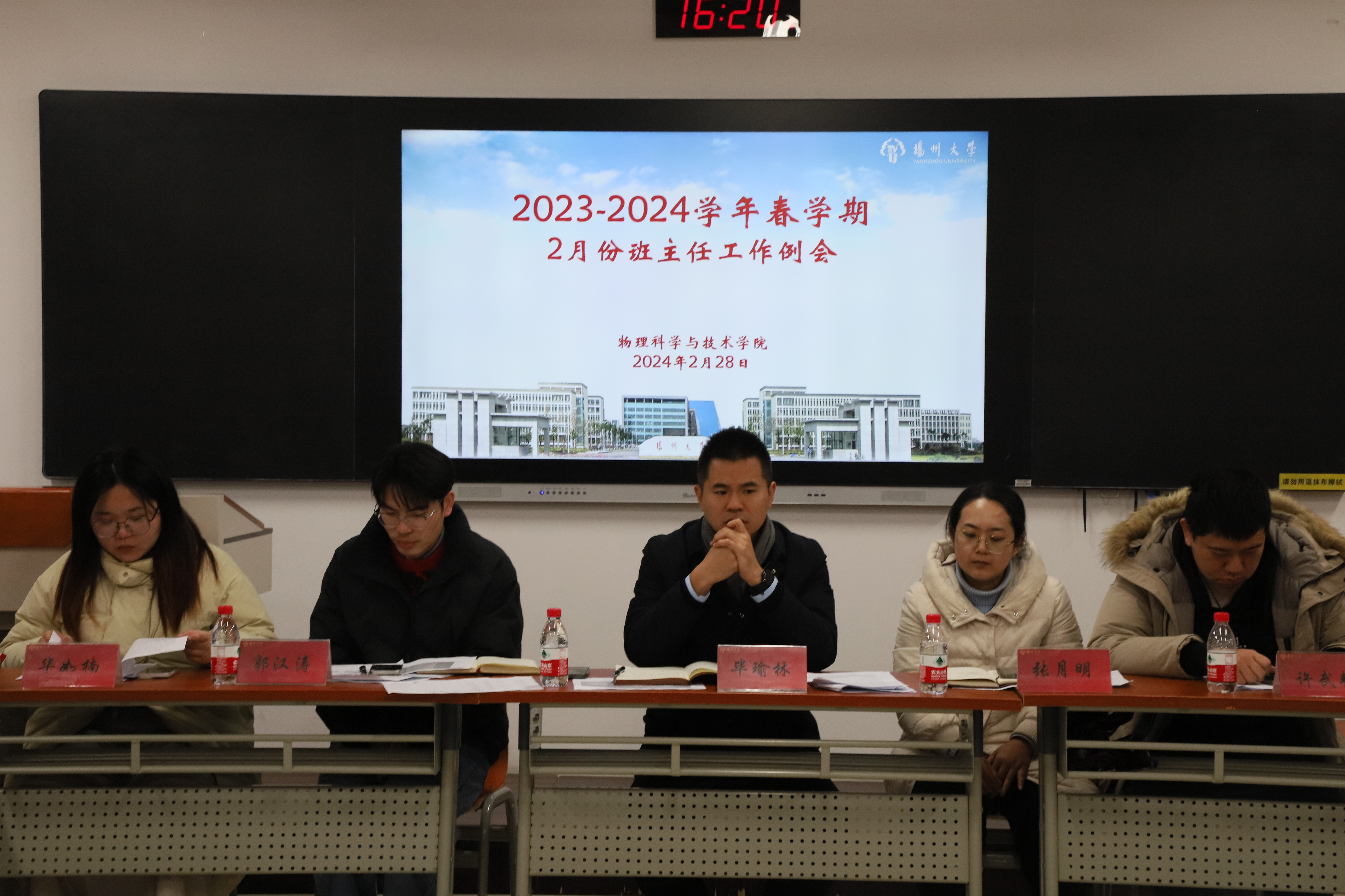 为进一步推进学生教育管理和服务工作的深入实施,我院于2月28日下午4时在瘦西湖校区S208教室,隆重召开了2023-2024学年春季学期2月份的班主任工作例会。院党委副书记毕瑜林老师出席本次会议,全体班主任及团委辅导员老师共同参加。会议由团委书记张月明老师主持。