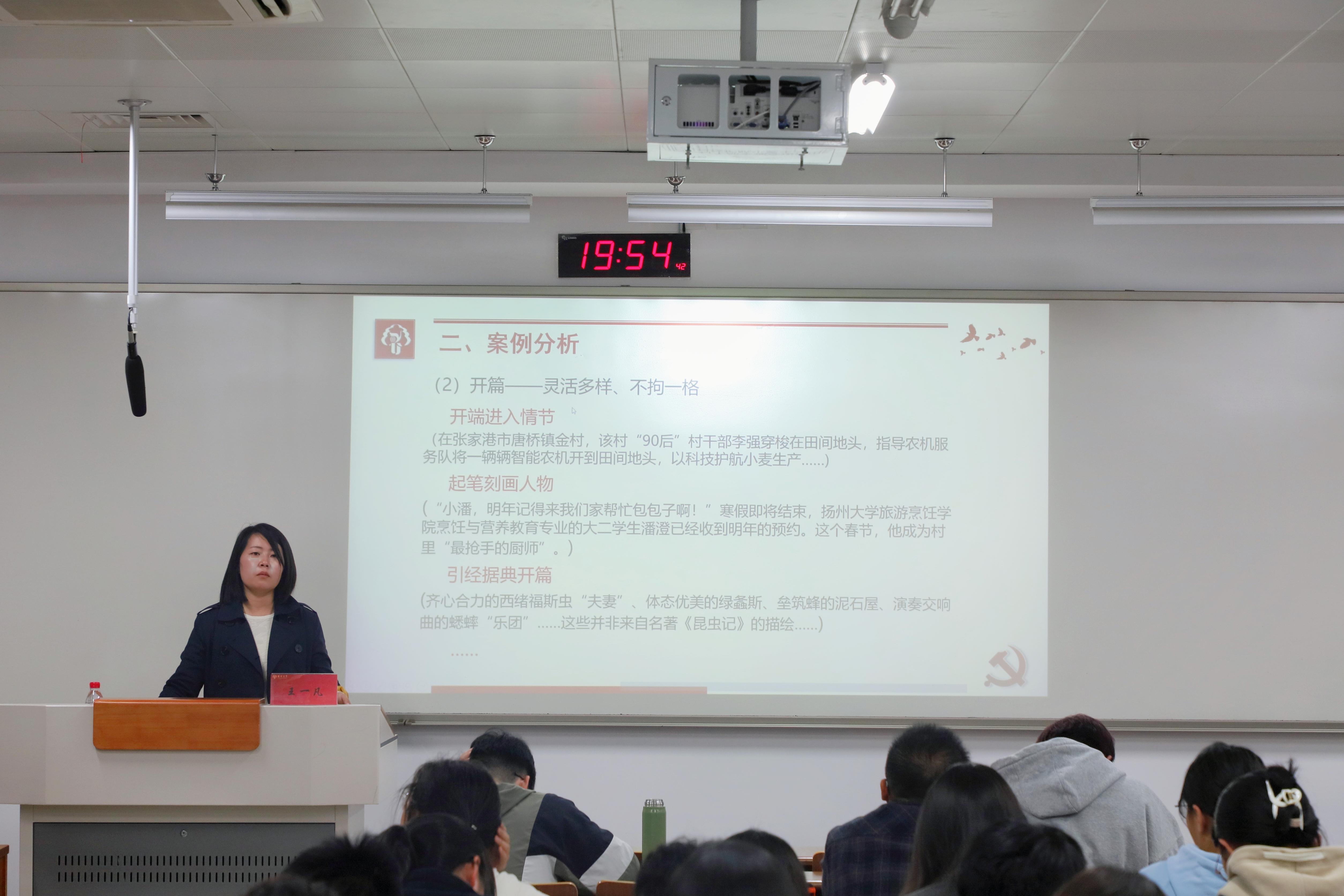 为增强我院学生的新闻宣传素养与实践能力,11月13日下午7点,我院邀请校党委宣传部新闻科秘书王一凡老师在瘦西湖校区N205为学院所有班级10月份推优选拔出的同学以及院宣报中心、院新媒体中心的同学们带来青年共产主义学校2024学年秋学期培训班团课第二讲:“全媒时代新闻宣传写作实务”。本次团课活动由团委辅导员郭汉涛老师主持。