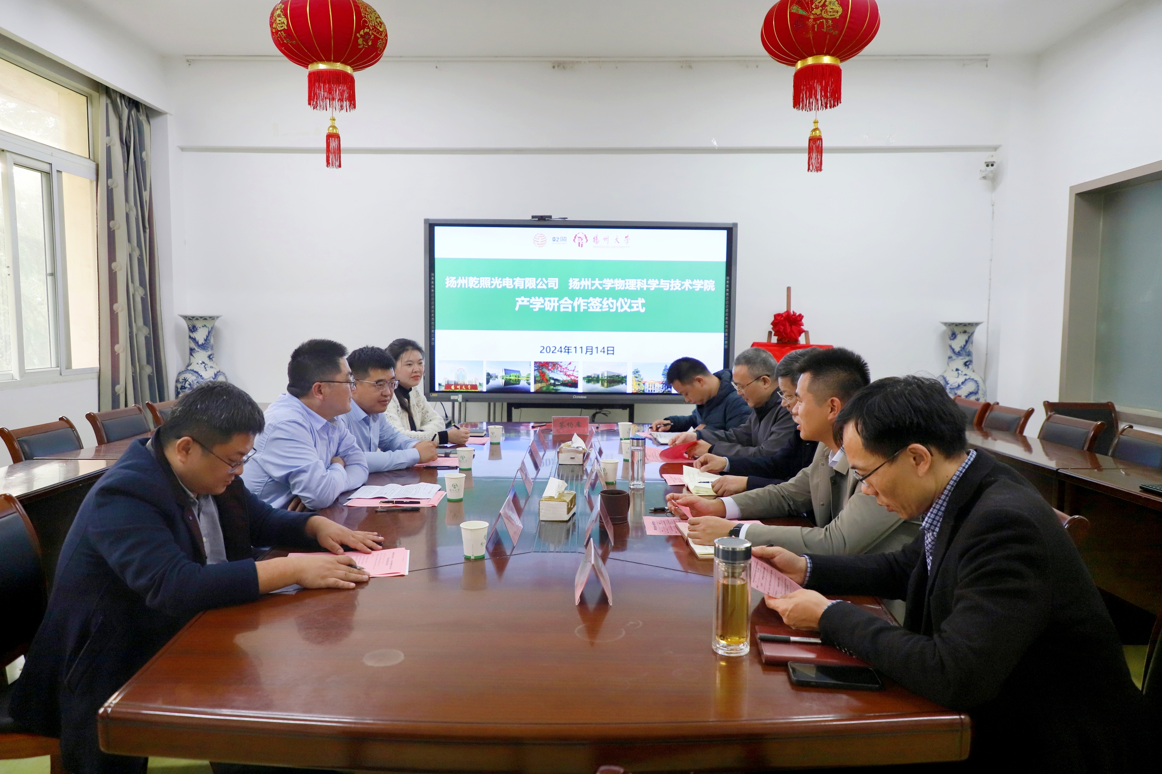 11月14日,扬州大学物理科学与技术学院与扬州乾照光电有限公司在物理楼213会议室隆重举行了产学研合作签约仪式。出席本次签约仪式的嘉宾包括扬州乾照光电有限公司总经理徐晓刚、综管部经理孙晓、招聘主管王之艳、行政主管陈天宏,以及扬州大学物理科学与技术学院党委书记王春雨、副院长王健、工会主席兼光电系主任陈海涛、教工第三党支部书记程立文等领导与嘉宾。仪式由我院党委副书记毕瑜林主持。