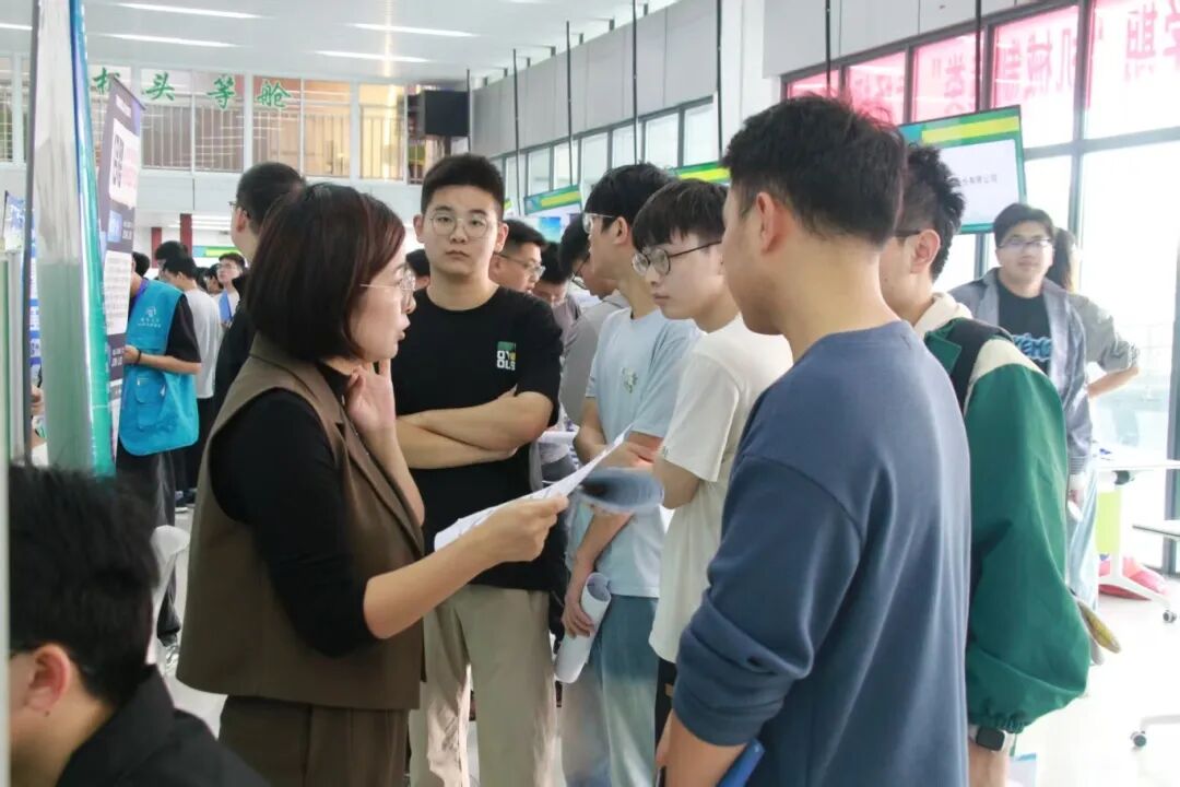 本次招聘会邀请了扬州扬杰电子、无锡华润微电子、聚灿光电(宿迁)、上海新微半导体等数十家知名企业参与,提供的岗位覆盖电子、光电、教育等多个领域,现场秩序井然,交流氛围热烈。同学们围绕岗位要求、职业发展前景、薪资待遇等关心的问题,与企业招聘代表深入沟通,充分展现出物理学院学子扎实的专业功底和积极的求职态度。