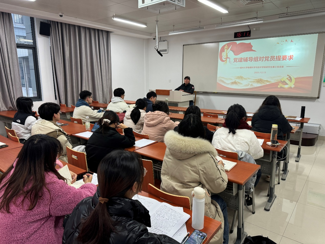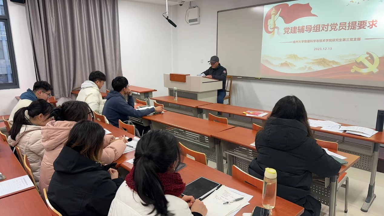 为进一步加强预备党员思想引领,端正入党动机。12月14日下午15:00,物理科学与技术学院研究生第三党支部在瘦西湖校区8号楼N304展开了一节别开生面的专题党课。本次党课由校关工委党建辅导组成员、院关工委副主任石竹南老师讲授,研究生第三党支部书记郭汉涛老师主持。