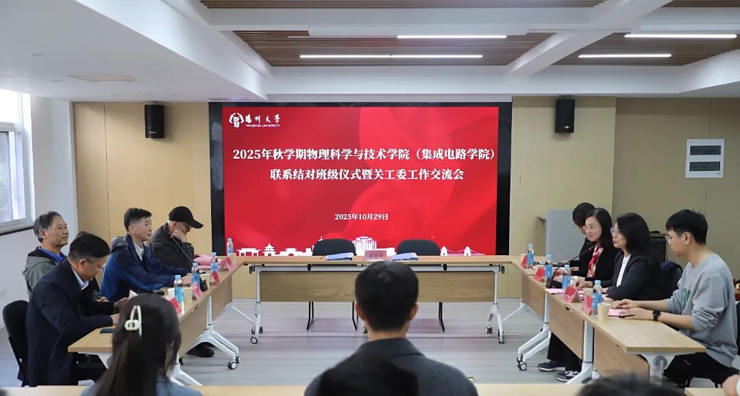为进一步强化班级建设,充分发挥大学育人功能,10月29日,我院于扬子津校区学生一站式服务中心会议室,举行了“2025年秋学期联系结对班级仪式暨关工委工作交流会”。院党委书记、关工委名誉主任邹明玮,扬州大学湖畔学生社区工作委员会主任、院关工委常务副主任王春雨,院关工委副主任顾长华、沈秋林、石竹南,以及院团委学工办全体成员、微电2501班学生代表共同参与了此次活动。活动由学院党委副书记、关工委主任姚婷主持。